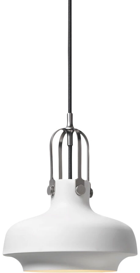 Copenhagen Pendel designet af Space Copenhagen Copenhagen SC6 Matt White Pendel blev designet med solid inspiration fra det maritime, da gaslamper fra hovedstadens havneanlæg kraftigt influerede formen. Selve grundformen blev moderniseret i processen men den lakerede metalskærm, der spændes fast på ledningen med udspændt buet metal emmer af den historiske baggrund. Udgangspunktet var at skabe et design, der ville tillade brugen af forskellige metaller, men også, at designet skulle virke ud fra en rent skulpturel vinkel med en enkel afslutning. Copenhagen SC6 Matt White Pendlerne er skabt med et enestående øje for detaljer og fokus på overfladestruktur, her er det klassiske kombineret med det moderne på en unik måde. At Space Copenhagen har stor erfaring som indretningsarkitekter er ikke nogen hemmelighed, og dette er da også synligt i den omhu der er lagt i designet. Fleksibiliteten der er bygget ind i lampen og den opmærksomhed der er lagt i detaljerne er grænsende til voldsom. Selv mængden af lys, der kommer ud af pendlen, var nøje planlagt fra starten. Skærmen er størst på midten og indsnævres i top og bund, hvilket er med til at give fylde og tyngde, samtidig med at beskueren beskyttes fra at kigge direkte ind i lyskilden. Space Copenhagen Pendel Designer: Space Copenhagen Type: Pendel Materialer: Metal Ledningslængde i alt: 4000 mm Ledningsmateriale: Stofledning Ledningsfarve: Sort Farve: Hvid Højde: 250 mm Diameter: Ø200 mm Lyskilde: G9 Anbefalet watt styrke: 40 watt