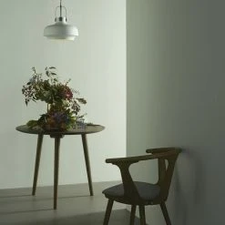 Copenhagen Pendel designet af Space Copenhagen Copenhagen SC7 Matt White Pendel blev designet med solid inspiration fra det maritime, da gaslamper fra hovedstadens havneanlæg kraftigt influerede formen. Selve grundformen blev moderniseret i processen men den lakerede metalskærm, der spændes fast på ledningen med udspændt buet metal emmer af den historiske baggrund. Udgangspunktet var at skabe et design, der ville tillade brugen af forskellige metaller, men også, at designet skulle virke ud fra en rent skulpturel vinkel med en enkel afslutning. Copenhagen SC7 Matt White Pendlerne er skabt med et enestående øje for detaljer og fokus på overfladestruktur, her er det klassiske kombineret med det moderne på en unik måde. At Space Copenhagen har stor erfaring som indretningsarkitekter er ikke nogen hemmelighed, og dette er da også synligt i den omhu der er lagt i designet. Fleksibiliteten der er bygget ind i lampen og den opmærksomhed der er lagt i detaljerne er grænsende til voldsom. Selv mængden af lys, der kommer ud af pendlen, var nøje planlagt fra starten. Skærmen er størst på midten og indsnævres i top og bund, hvilket er med til at give fylde og tyngde, samtidig med at beskueren beskyttes fra at kigge direkte ind i lyskilden. Space Copenhagen Pendel Designer: Space Copenhagen Type: Pendel Materialer: Metal Ledningsmateriale: Stofledning Ledningslængde: 4000 mm Ledningsfarve: Sort Farve: Mat hvid Diameter: Ø350 mm Højde: 400 mm Fatning: E27 Anbefalet watt styrke: 100 watt