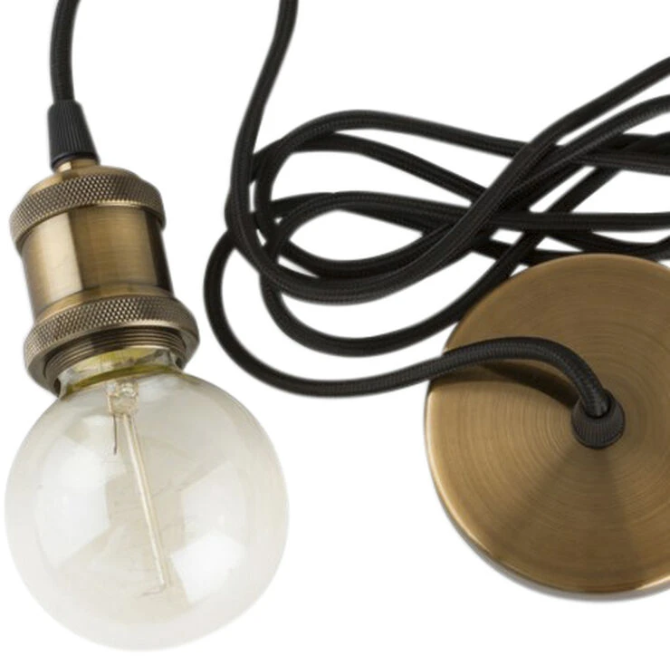 Vintage design pendel fra e3light Beskrivelse. Vintage stil E27 fatning og loftsrosette i vintage kobber finish, 3mtr sort tætvævet stofledning. Fatningen er model inkl. montagering til eventuel kombination med en lampeskærm (ej inkl.). Specifikation: – Skærm højde: 65 mm – Skærm diameter: 50 mm – Ledningslængde I alt : ca. 300 cm – Ledningslængde – udenfor lampen: ca. 300 cm – Ledingstype og farve: Sort tætvævet 3-ledet stofledning – Rosette/ Baldakin højde:25 mm – Rosette/ Baldakin diameter: 100mm Pære informationer: : – Fatning: E27 – Anbefalet lysekilde: e3light Vintage LED – Anbefalet watt styrke: max 100W – Max watt styrke: 100W – Energiklasse: Kan benyttes med A++ – E lyskilder Kan benyttes med lysdæmper – men husk den valgte pære skal fungere med dæmperen Der medfølger ikke pære. Pære købes separat.