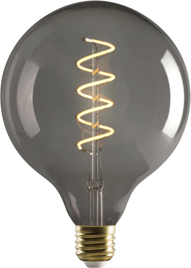 Røgfarvet G125 4W Vintage LED pære fra e3light Beskrivelse. 4W Røgfarvet LED pære i klassisk dekorativ globe 125mm form og med filament i spiral design – afløser 40/60W dekorativ kultrådsglødepære med stor (E27) sokkel. Kan dæmpes med LED dæmper, pære med ekstra høj farvegengivelse (CRI>90), ekstra varm lysfarve på 2200K. Specifikation: – Teknologi: LED – Fatning: E27 – Voltage: 220-240V – Wattage: 4W – Svarende til glødepære: 15W traditionel og 40W kultrådspære – Pære diameter: 125 mm – Pære højde: 174 mm – Glas finish: Røgfarvet = blændfri – Lysstyrke (lumen): 140 lm – Farvetemperatur (kelvin): 2200K = ekstra varm hvid – Farvegengivelse (CRI): >90 CRI – Øjeblikkelig fuld lysstyrke: Ja – Energiklasse: A – Forbrug: 4 kWh/1000h – Dæmpbar: Ja – udviklet til brug med LK Touch LED lysdæmpere. Ved større antal pærer tilsluttet samme dæmper, tjek dæmperens tilladte totalbelastning