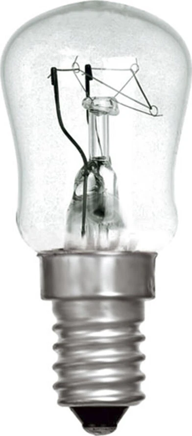 ST26 15W glødepære fra GE/TU Beskrivelse. 15W klassisk parfumeglødepære/pygmy med lille (E14) sokkel. Virker med alle lysdæmpere Velegnet til frysere og køleskabe da den kan klare ned til -30g C. Specifikation: – Teknologi: Glødepære – Fatning: E14 – Voltage: 230V – Wattage: 15W – Svarende til glødepære: – Pære diameter: 28 mm – Pære højde: 60 mm – Glas finish: Klar – Lysstyrke (lumen): 85 lm – Farvetemperatur (kelvin): 2700K = varm hvid – Farvegengivelse (CRI): >99 CRI – Øjeblikkelig fuld lysstyrke: Ja – Energiklasse: E – Forbrug: 15 kWh/1000h – Dæmpbar: Ja – virker med alle lysdæmpere. Ved større antal pærer tilsluttet samme dæmper, tjek dæmperens tilladte totalbelastning