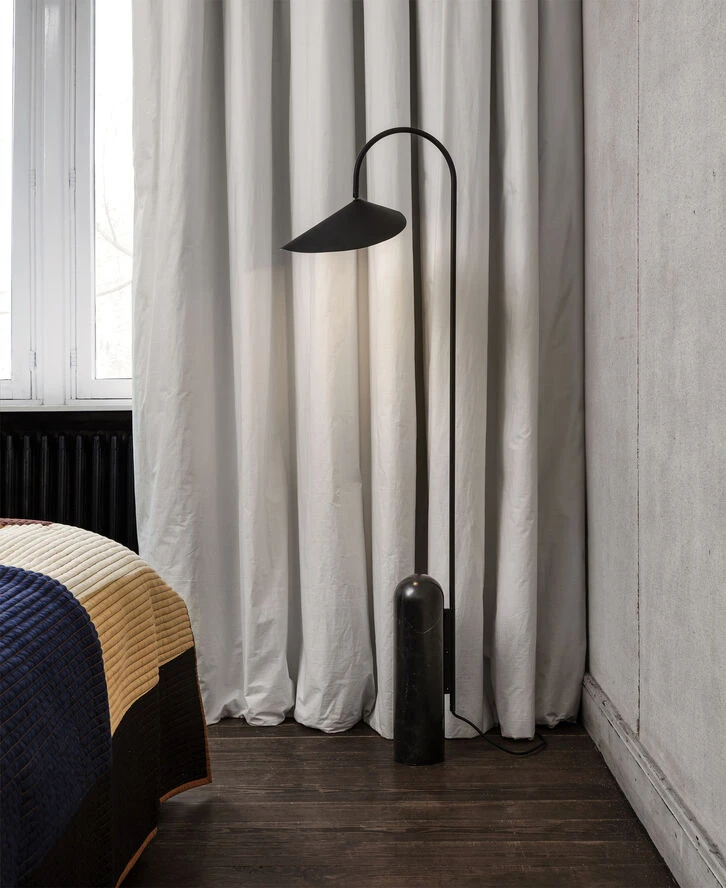 Arum-bordlampen er karakteriseret ved sin sorte fod af solid marmor kombineret med den organisk udformede lampeskærm. For at opnå den perfekte balance i lampens decentrerede struktur står den sorte marmorfod som modvægt til den blide måde, hvorpå lampeskærmen hænger fra den bøjede metalstang – nærmest som et blad på en stængel. Med en mat, cremefarvet inderside af skærmen giver lampen et blødt og jævnt fordelt lys, og lampeskærmen kan justeres, så du får optimale lysforhold i alle situationer.