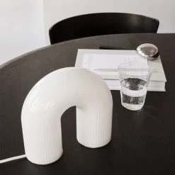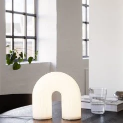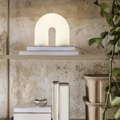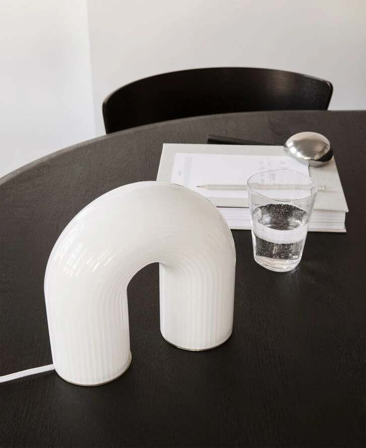 Vuelta-lampen er en prangende lyskilde med en skulpturel bue, der minder om gamle søjler. Den er lavet af opalglas med en rillet overflade, som giver den et tiltrækkende stofligt udtryk. Den er designet med en LED-lyskilde, der udsender et blødt, diffust lys, og den er udstyret med en justerbar lysdæmper til det ultimative stemningslys. Brug den som en dekorativ lampe i et mørkt hjørne eller på en hylde for at lyse bogsamlingen op.