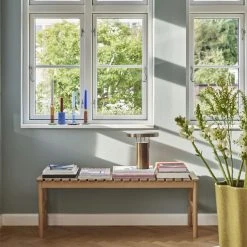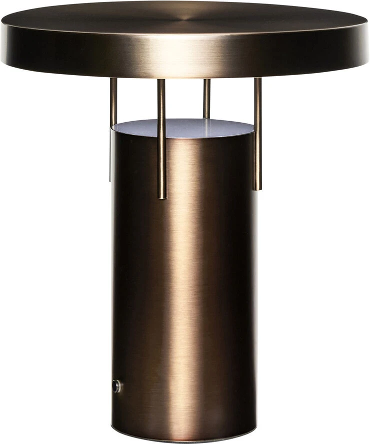 Genopladelig bordlampe til indendørs og udendørs brug med tænd-sluk og lysdæmpende touch-funktion. Farven er bruneret messingfarve.