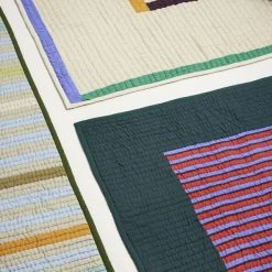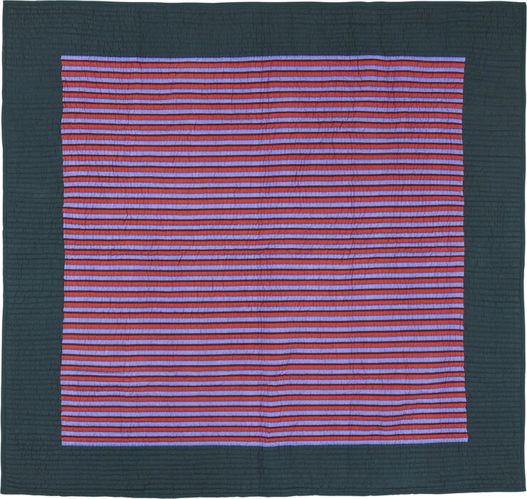 Quiltet sengetæppe med striber i lilla, bordeaux og røde farver med petrolfarvet bred bort og bagside.