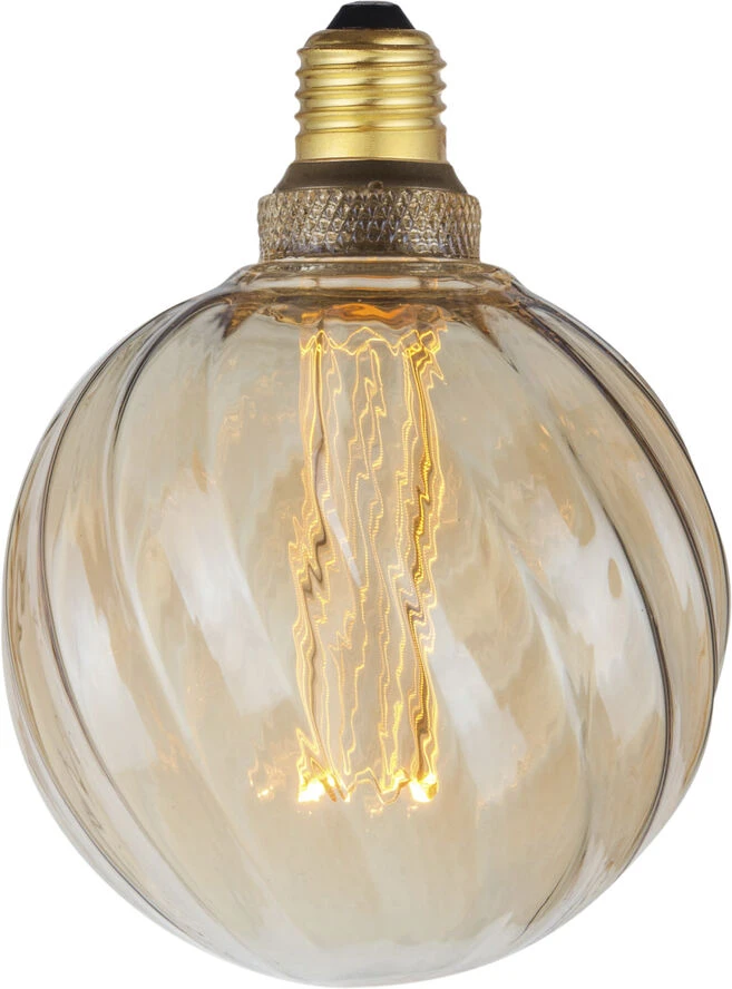 COLORS TWIST AMBER lyskilde fra Halo Design er en LED lyskilde der giver et varmt behageligt lys, og med det smukke design med det specielle snoet glas, får man ikke blot et smukt lys men samtidigt også en pære der afgiver et smukt design i sin form og udstråling. Lyset som ses igennem det smukke dekorative glas er som vi kender det fra de gode gamle dage bare med en gylden farve (1800 kelvin grader) – her får man skabt rammen om at kunne skabe samme stemning med hyggeligt lys til behagelige omgivelse. Lyskilden er meddet gyldne amberfarvet glas og spreder lyset 360 grader, hvilket giver den perfekte belysning i rummet. vi kan varmt anbefale hvor den sidder frit synlig i en fatning. Til trods for at den kun forbruger 5 watt, er den og dæmpbar det vil sige at man via sin kontakt i væggen kan dæmpe den i 3 trin, så er der rig muligt for netop at kunne skabe præcis den stemning i rummet man ønsker. TWIST lyskilderne er tillige med Memory funktion, som gør at den husker sidste settings og starter derfor op præcist hvor du slukkede sidst. Serien findes i flere størrelser og farver, der findes også en til din lampe.
