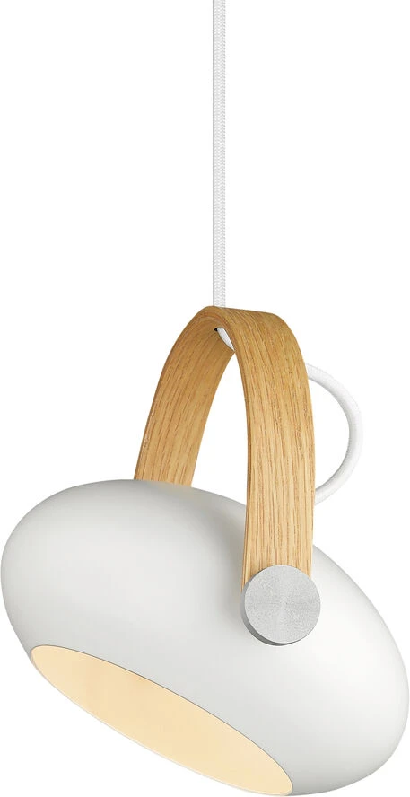 DC Pendel Ø18 cm i metal med træ deko-beslag i ægte træ. DC er en helt unik lampe-serie tegnet og designet i samarbejde mellem Michael Waltersdorff og Emanuele Patton. DC er et gennemført design af dansk når det er bedst og et touch af det italienske fra Emanuele. Med denne pendel som er den mindste ud af 3 størrelser, får man en metal lampe hvor man kan vinkle sleve lampe hovedet og rettet lyset i den vinkel man passer perfekt til rummet. Pendlen stofkabel og roset til loftet, nem at installere. En super flot kombination mellem metal og træ, qua beslaget der er udført i rigtig træ og med aluminiums skruer på siden, der giver en smuk kontrast. Der er rig mulighed for at skabe det helt rigtige lys i hjemmet da der er anvendt G9 fatning, så nu kan der vælges alt op til 28 watt. DC serien findes i flere varianter og størrelser samt 2 farver Dansk design kvalitet – ingen kompromis.
