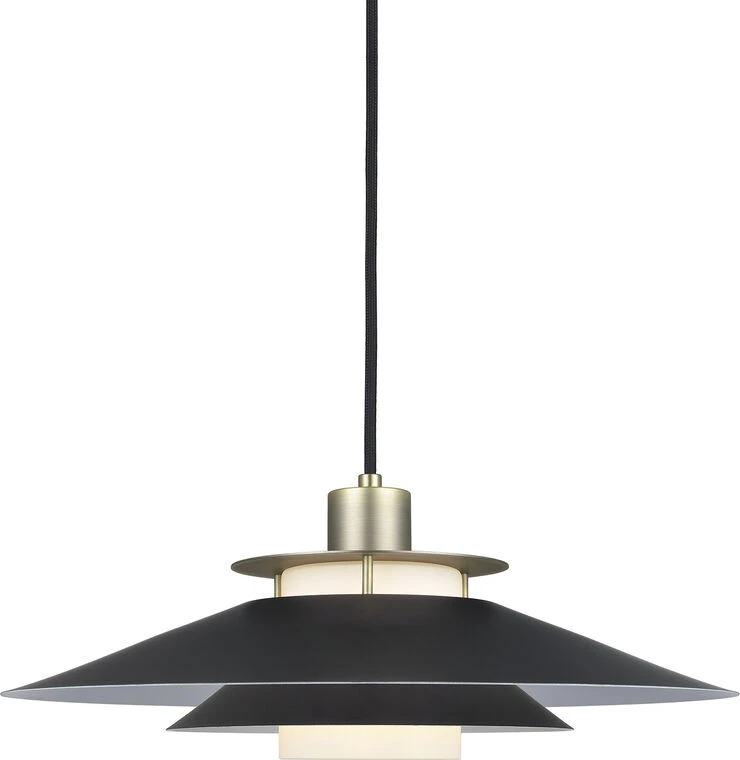 Rivoli pendel Ø40 cm i sort med messing top, er med hvidlakeret inderskærm, som giver den perfekte refleksion af lyset og presser lyset fra pærer ud af lampen for at få så meget lys ned på et evt. bord. Rivoli er designet af Michael Waltersdorff, og sender et klar budskab om dansk design. Rivoli er et design som man roligt kan kalde tidsløs. Med det hvide inderglas sikre man at pæren bliver kapslet ind og sikre at man ikke bliver blindet at pærer og at man får det perfekte lys. Denne model her leveres med stofledning der giver det sidste pift er flotte detaljer. Rivoli er med E27 fatning så der er lagt optil mange muligheder for at sætte den rette belysning. Rivoli er en serie af lamper lige fra små pendler til bord tilgulvlamper. Halo Design – We create light for those who care