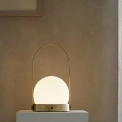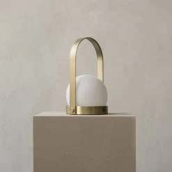 Carrie LED-lampen er designet som en bærbar, letvægtslampe og er unik for dens mange anvendelser og foranderlighed. Med et slankt, funktionelt håndtag og en varm lyskugle, der forsigtigt ligger i en kurvlignende base, er lampen anvendelig næsten overalt; selv på farten, da den er ledningsfri og kommer med USB-oplader. Flyt den fra dit kontor til dit natbord, til din aftenpicnic i parken og i din cykelkurv, mens du kører hjem. Den bærbare LED-lampe kommer i sort, hvid, brændt rød, olivengrøn, børstet messing og bronzeret messing med læder. Den tilbyder et varmt lys i tre indstillinger, perfekt til at skabe en hyggelig atmosfære. Fuldt opladet vil den forblive tændt i ti timer.<br><br>Vigtig brugsinformation: For at holde det interne batteri sundt, lad kun Carrie være tilsluttet under opladning med lampen slukket. Lad ikke stikket være tilsluttet, mens det er i brug.<br><br>• USB-kabel og adapter<br>• Intern LED-lyskilde vurderet til 25.000 timer<br>• Lyskilde: 384 Lumen, 2700K, CRI80+ (kan ikke udskiftes)<br>• Dæmpbar, 4-trins (0%, 10%, 50%, 100%)<br>• 3,7V 5000mAh internt genopladeligt lithiumbatteri (10-timers kapacitet)<br>• Aftageligt håndtag<br>• Ladekabel medfølger (USB til Micro-USB)<br>• Strømstikadapter inkluderet (USB til to-bladet US-stik)