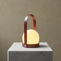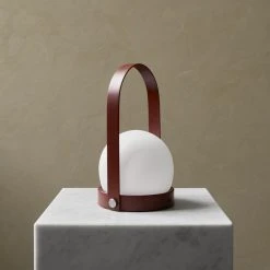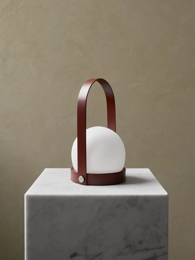 Carrie Table Lamp, Portable, IP44 er designet som en bærbar, letvægtslampe og er unik for dens mange anvendelser og foranderlighed. Med et slankt, funktionelt håndtag og en varm lyskugle, der forsigtigt ligger i en kurvlignende base, er lampen anvendelig næsten overalt; selv på farten, da den er ledningsfri og kommer med USB-oplader. Flyt den fra dit kontor til dit natbord, til din aftenpicnic i parken og i din cykelkurv, mens du kører hjem. Den bærbare LED-lampe kommer i sort, hvid, brændt rød, olivengrøn, børstet messing og bronzeret messing med læder. Den tilbyder et varmt lys i tre indstillinger, perfekt til at skabe en hyggelig atmosfære. Fuldt opladet vil den forblive tændt i ti timer.<br><br>Vigtig brugsinformation: For at holde det interne batteri sundt, lad kun Carrie være tilsluttet under opladning med lampen slukket. Lad ikke stikket være tilsluttet, mens det er i brug.<br><br>• USB-kabel og adapter<br>• Intern LED-lyskilde vurderet til 25.000 timer<br>• Lyskilde: 384 Lumen, 2700K, CRI80+ (kan ikke udskiftes)<br>• Dæmpbar, 4-trins (0%, 10%, 50%, 100%)<br>• 3,7V 5000mAh internt genopladeligt lithiumbatteri (10-timers kapacitet)<br>• Aftageligt håndtag<br>• Ladekabel medfølger (USB til Micro-USB)<br>• Strømstikadapter inkluderet (USB til to-bladet US-stik)