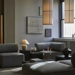 The collections pendant light is created with the same column-like shape as the floor and table lamp, carefully covered with translucent fabric that reveals the graphic structure within and suspended from the ceiling by a textile cord. Spreading ambient light in a room, it makes a purposeful pendant above a dining table, in a reception area or hotel bedroom. [dimensions-start] Small: H: 45 cm (60 cm), Ø: 18 cm Large: H: 75 cm (90 cm), Ø: 30 cm [dimensions-end] [materials-start] Light Bulb Socket: E27 No bulbs included [materials-end] [additional-resources-start] DOWNLOADS PRODUCT FACT SHEET 2D/3D FILES ASSEMBLY INSTRUCTIONS [additional-resources-end]