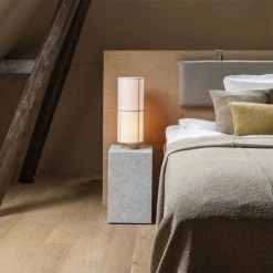 ?Hashira, Table Lamp Shaped from the basic geometric form in architecture, the slender cylindrical table lamp takes its cues from the translucent fabric of Japanese lanterns and window blinds to softly diffuse the light in multiple directions. It is set on an ash base that underpins the minimalist expression. [dimensions-start] H: 49,5 cm, Ø: 18 cm [dimensions-end] [materials-start] Light Bulb Socket: E27 No bulbs included [materials-end] [additional-resources-start] DOWNLOADS PRODUCT FACT SHEET 2D/3D FILES ASSEMBLY INSTRUCTIONS [additional-resources-end]