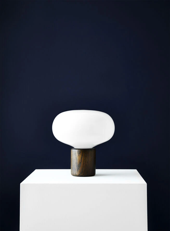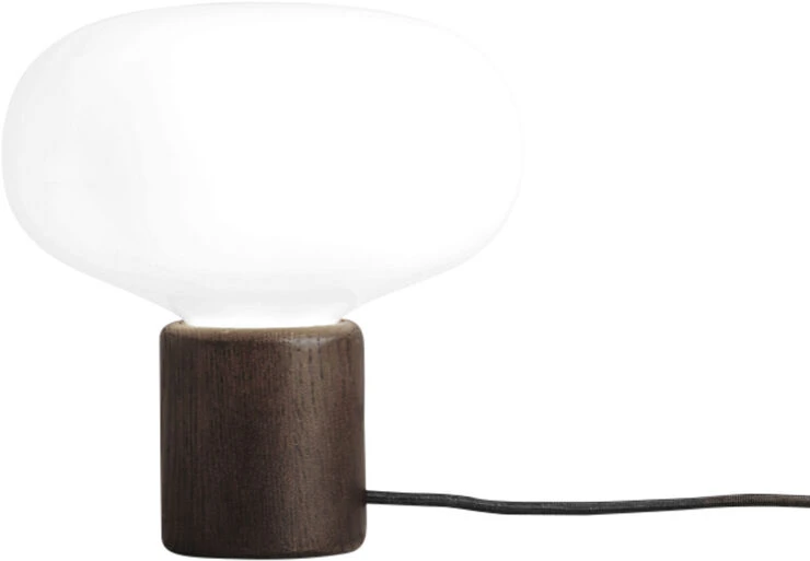 Karl-Johan Table Lamp er inspireret af den organiske form på svampen af samme navn. Den lette top i glas giver et blødt lys, som står i smuk kontrast til den solide base i røget eg eller sort marmor. Designet af Signe Hytte.