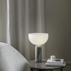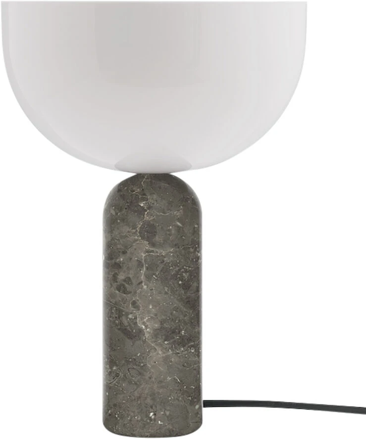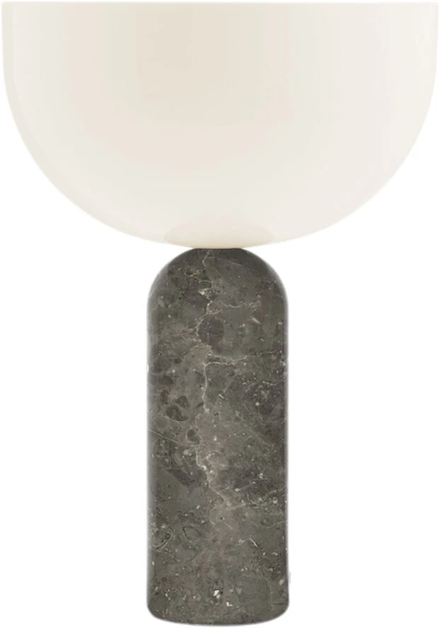 Den ikoniske Kizu bordlampe opnår et udtryk af ro og tyngde i en varm grå marmorvariation. Stenarten Gris du Marais’ changerende overflade står i kontrast til lampens rene, hvide top, mens de lyse aftegninger i stenens naturlige mønster binder de to elementer sammen. I en leg med former og materialer, som kulminerer i kyssepunktet mellem de to dele, spreder Kizu sit bløde lys som en fængende moderne skulptur.