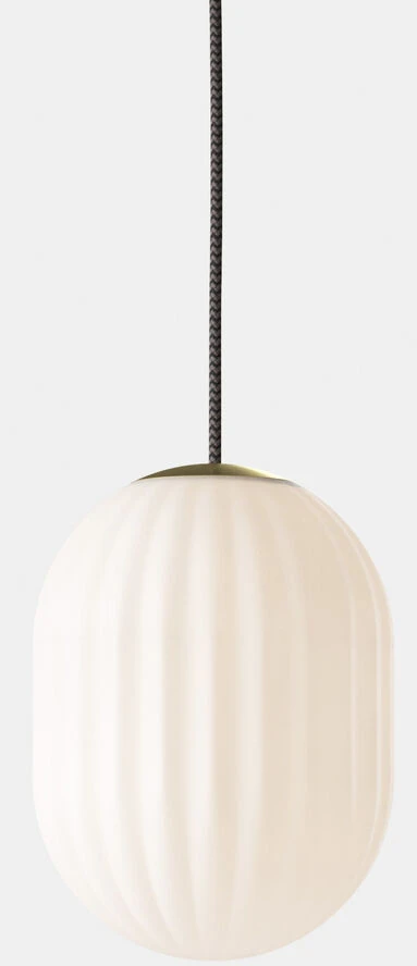 Bright Modeco pendel i hvid opal glas og messing med sort stofledning fra Nordic Tales. Denne art deco inspirerede lampe har smukke riller i overfladen og en aflang form, som er virkeligt elegant. Lampen er lavet af en mundblæst kuppel i hvid opal glas med en gylden messing fatning, som er en perfekt kombination.<br><br>Dia.: 20 cm | Højde: 26 cm | Ledning. sort stofledning, 3 meter lang. Fatning: E27 cm, max 25 WATT