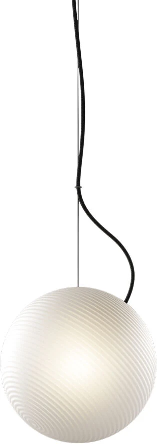 Bright Ripple er produceret af mundbl�st glas. Overfladen er mat og f�som satin. Lampen har en riflet overflade som giver det s�rlige kendetegn. Bright Ripple er inspireret af kapillarb�, ogs� kaldet ringe i vandet. Bright Ripple kommer med en tre meter stofledning samt en to meter st�l wire til montering i loftet. Lampen har en diameter p� 200mm. Lampen kommer med en E27 fatning.
