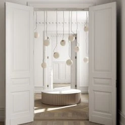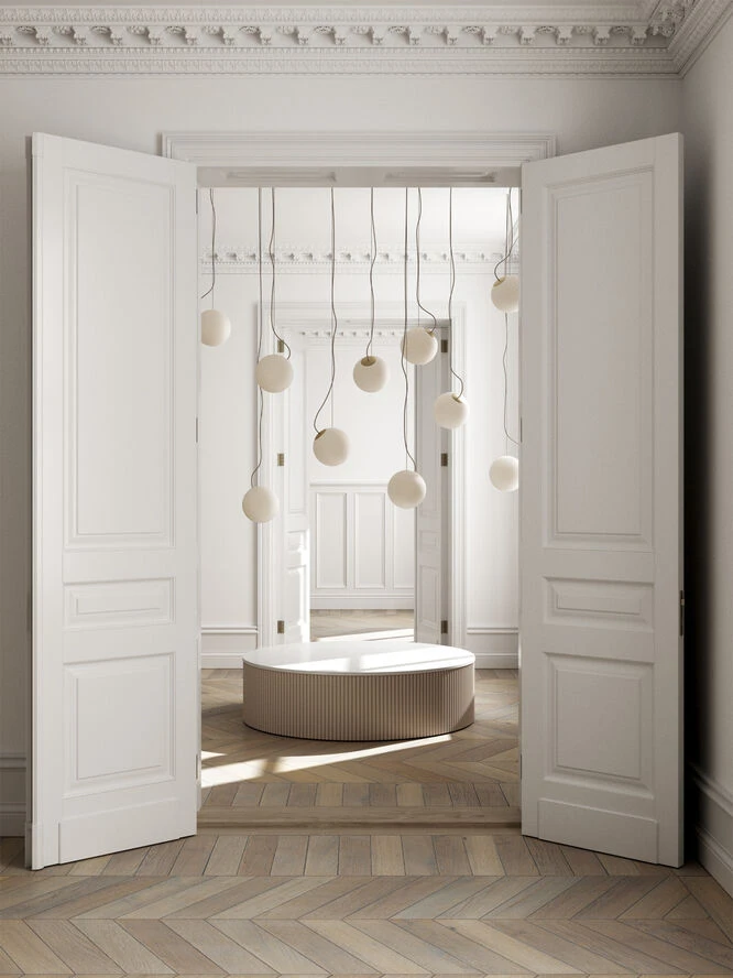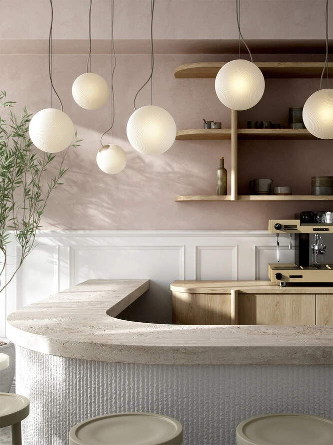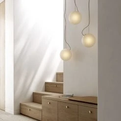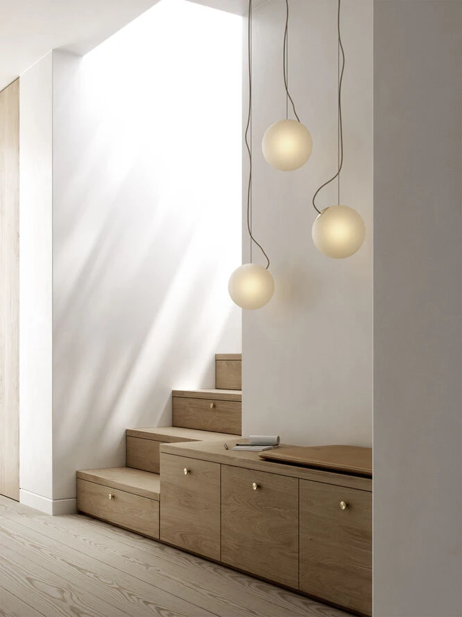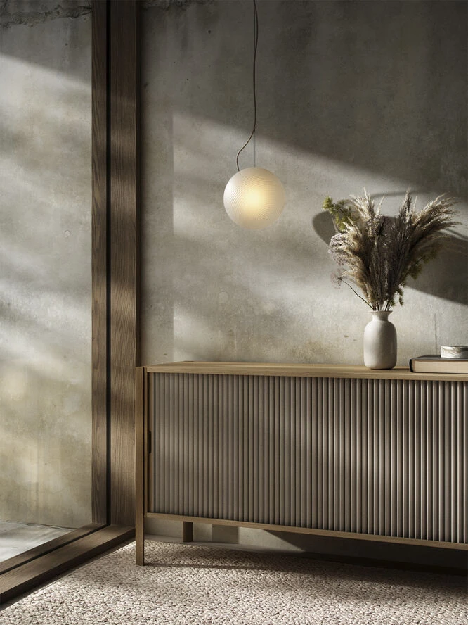 Bright Ripple er produceret af mundbl�st glas. Overfladen er mat og f�som satin. Lampen har en riflet overflade som giver det s�rlige kendetegn. Bright Ripple er inspireret af kapillarb�, ogs� kaldet ringe i vandet. Bright Ripple kommer med en tre meter stofledning samt en to meter st�l wire til montering i loftet. Lampen har en diameter p� 200mm. Lampen kommer med en E27 fatning.