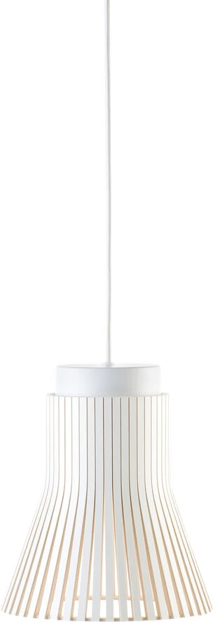 The Petite 4600 pendant, playful and compact. This pendant was developed based on multiple requests for a smaller lighting fixture. Material: Formpressed birch slats, painted steel cylinder. Sizes: Height 23 cm. Diameter Ø 20 cm. Weight 0,8 kg. Light source: GX53 base, LED max 7 W. Comes with a LED bulb (Airam Pro LED GX53, 6 W, 3000 K, 470 lumen, dimmable, may vary). The use of special bulbs such as halogen, mirror or 12 V bulbs in Secto Design lamps is prohibited, due to overheating. Cable: 175 cm, textile cable, connector, ceiling cup. Maintenance: Wipe dust regularly. To remove fresh stains wipe with a slightly moist cloth.