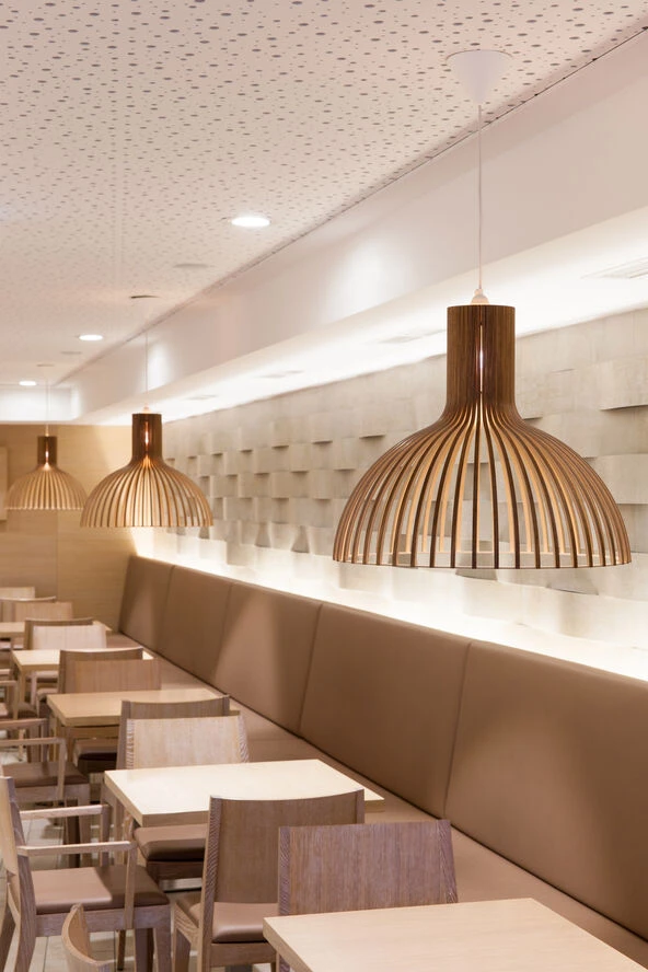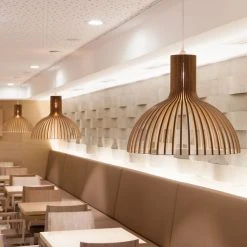 Victo invites people to gather around it. Perfect interior decor above a table providing a warm and cosy light. Material: Formpressed birch slats. Sizes: Height 48 cm. Diameter Ø 56 cm. Weight 1,5 kg. Light source: E27 base, LED max 20 W. Comes with a LED bulb (Airam Pro LED, E27, 12 W, 1060 lumen, 3000 K, pure white, dimmable, may vary). The use of special bulbs such as halogen, mirror or 12 V bulbs in Secto Design lamps is prohibited, due to overheating. Cable: 150 cm, textile cable, ceiling plug/connector, ceiling cup. Maintenance: Wipe dust regularly. To remove fresh stains wipe with a slightly moist cloth.