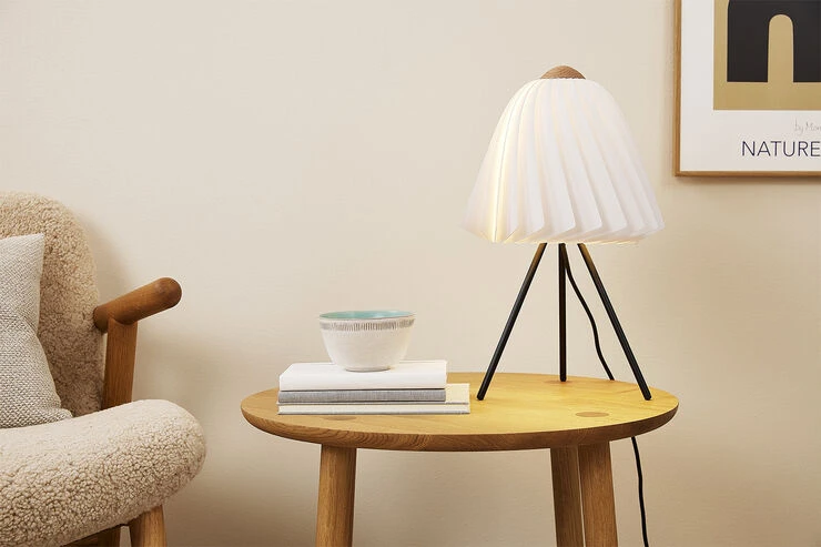 Ballet er en yndefuld bordlampe, så let og elegant som kunstarten, den har sit navn fra. Stil den i dit hjem, og nyd dens bløde lys og smukke form. De slanke, sorte ben og de lette, hvide lameller, der samles i en træknop øverst på lampen, giver Ballet sit helt eget udtryk. Den sorte tekstilledning passer flot ind i designet, og med den lille lysdæmper kan du justere lyset, som du ønsker.