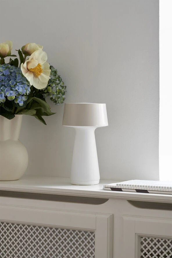 Ember er en skøn lille lampe, der er nem at oplade. Med sit bløde lys fungerer den godt som natlampe til soveværelset. Du kan også tage Ember med udenfor, når du vil nyde en aftenstund på terrassen eller altanen. I bunden af Ember finder du en lysdæmper. Her kan du skifte imellem Embers tre lysstyrker. Selve designet minder om en klassisk bordlampe, men som en opfindsom detalje, så kommer lyset ud af armaturet i opalglas.