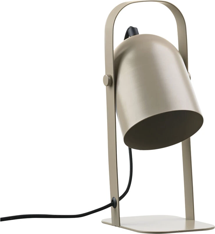 Bordlampe i sandfarvet jern med skærm, der kan vippes til den ønskede position. 1,5 m sort polyesterledning. E14-fatning. Maks. 15 watt.