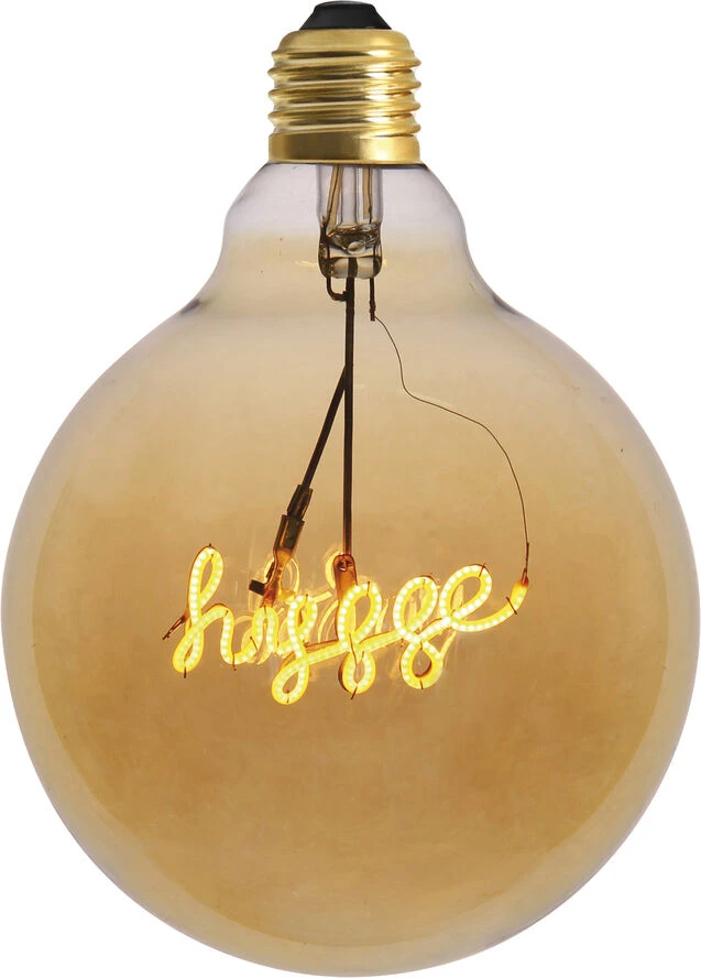 Colors HYGGE G125 DIM LED lyskilde fra Halo Design er en LED lyskilde der giver et varmt behageligt lys, og med det smukke design som vi kender det fra de gode gamle dage som giver 1800 kelvin grader – nemlig glødetråden, danner denne rammen om at kunne skabe samme stemning med hyggeligt lys som tillige er skrevet som bogstaver imed LED lyset, skabt til at give en behagelig belysning.